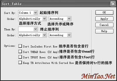 5.对于Sort THEAD Rows(If Any)、Sort TFOOT Rows(If Any)两选项,是Dreamweaver MX中新增加的。