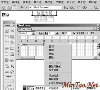 1、选定层面,当鼠标变成“十”字形时按住左键将层面拖动到页面右上角(使整个菜单条完全露出但上边缘正好靠拢页面上边界),在窗口菜单中打开时间线面板,选定层面将其拖动到时间线上,Dreamweaer会自动产生一个长度为15帧的动画对象,拖动该动画对象的最后一个关键帧到第30帧,将其长度设置为30帧。然后在第15帧处单击右键,在弹出的快捷菜单中选择“添加关键帧”选项插入一个关键帧,并将层面拖动到适当位置(如图2)。在时间线窗口中的第15帧处再次单击右键,在弹出的快捷菜单中选择“添加动作”,为该帧添加一个交互行为,Dreamweaer将自动打开行为面板。单击行为面板中的“+”按钮,从弹出的菜单中选择“Timeline/Stop Timeline”,打开“Stop Timeline”对话框,选择“Timeline1”后单击“确定”按钮关闭该对话框。交互行为的事件为“onFrame15”,动作为“Stop Timeline”,这样当时间线运行到第15帧时,动画将停止播放,这样就实现了菜单条弹回的功能。