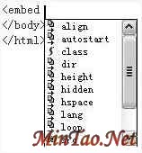 它的使用方法与第一种基本一样,只是第一步的代码提示框里不要选择gbsound,改而选择embed即可。然后再选择它的属性进行相应的设置(图3),从图中可看出embed的属性比gbsound的五个属性多许多。最后的代码如下:〈 embed src="music.mp3" autostart="true" loop="true" hidden="true"〉〈 /embed〉。