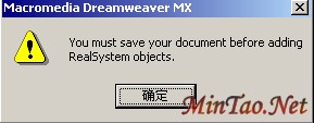 第一步,保存网页。在网页中插入任何RealMedia的控件时,必须先保存网页,不然会出现图2的对话框。