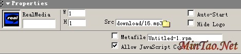 第三步,这是就可以修改Properties中的各项参数了。RealMedia Audio各项参数设置如图4所示,RealMedia一栏中可以输入对应的名字,W栏H栏就是我们一般所见到的长与高,它的默认属性是1*1。Src是播放的文件具体的地址,可以点击文件夹进行重新选择。为了让用户一打开这个页面,就听到悦耳的音乐,勾选Auto-Start。一般的音频文件播放时,会出现Real Networks的商标,如果勾选了Hide Logo这个选项,那么商标就不再出现了。