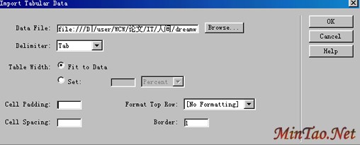 2、在Dreamweaver MX编辑窗口中单击“Insert/Table Objects/Import Tabular Data...”,打开“Import Tabular Data”对话框,如图1所示。