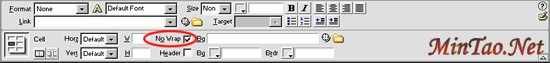 5、选中所有单元格,在属性面板中勾选No Wrap后复选框,如图2所示,这样单元格中数据将不换行显示,在IE中浏览时可能在水平方向上超过显示屏幕显示。