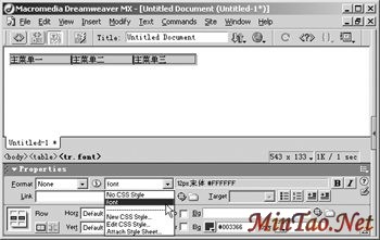 建立主菜单栏 新建页面,执行菜单“Insert/Table”命令打开“Insert Table”对话框,插入一个一行多列的表格,表格列数由你的菜单条目决定,同时设置“Cell Padding”、“Cell Spacing”以及“Border”参数(如图1)。在建立的表格中输入主菜单导航文字,选取表格及文字后,用快捷键“Ctrl+F3”打开其属性窗口,我们可以定义一个字体控制CSS来控制文字属性,调整相关参数(如图2)。