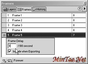 在这张做好效果图基础上,制作鼠标移开时的动态GIF效果图。执行菜单“Windows/Frames”命令打开帧控制面板,点击四次面板下部“New Frame”按钮添加四帧,添加这四帧作用是:在每一帧上设置由长到短的淡灰色(#F1F1EF)背景层图片以实现动态变换效果。选取第一帧图片中的淡灰色背景层图片,单击帧面板右上角三角形按钮,执行弹出菜单“Copy to Frame”命令,在“Copy to Frames”对话框中选择“All Frames”确认将淡灰色背景层图片复制到各帧中,当然别忘记也将黄褐色(#FF9900)矩形层图片也复制到各帧中。选取第一帧图片,使用鼠标调整淡灰色背景层图片大小至编辑可视区域右侧1/5处。同理调整2、3、4帧淡灰色背景层图片逐渐变短至消失于左侧黄褐色小矩形中,选取油漆桶填充颜色为深紫色(#003366),填充黄褐色小矩形为该色。为了使效果更加流畅,双击帧控制面板各帧后时间延迟参数,将其设置为“8”(如图2)。最后导出mouseout.gif动画文件。