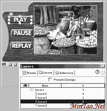 利用Photoshop制作一个金属效果的播放器外观。(具体效果就看你的喜好啦,也许你可从Winamp的skin中受点启发)。作最佳优化后,输出一个透明的GIF图片。为了让鼠标移上后按钮有些变化,你不得不每个按钮制作2张图片(共6个),两个按钮只需有颜色上的差异即可。先建三个层,调整好位置,并插入三个播放键的各自的二张翻滚图片(Rollover Image)(Insert-Rollover Image)。通过调节层的Index-Z的值,确保播放器所在的层在Layer_main层的上面,在按钮所在层的下面。排版好的各层如图1所示。