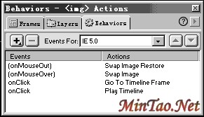 点击选择REPLAY所在的图片。在行为浮动工具面板中,从+(添加)动作下拉列表中选择Timeline---Go to Timeline Frame(转向放时间链帧),并在弹出的对话框中选择时间链Timeline_main,在Frame文本框中输入1。单击OK。默认方式下,就会为切换动作设置一个onClick事件。再添加下一个动作。从+(添加)动作下拉列表中选择Timeline---Play Timeline(播放时间链),并在弹出的对话框中选择时间链Timeline_main。单击OK。默认方式下,就会为切换动作设置一个onClick事件。REPLAY的图片添加好的行为如图3所示。