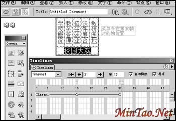 1、选定层面,当鼠标变成“十”字形时按住左键将层面拖动到页面右上角(使整个菜单条完全露出但上边缘正好靠拢页面上边界),在窗口菜单中打开时间线面板,选定层面将其拖动到时间线上,Dreamweaver会自动产生一个长度为15帧的动画对象,拖动该动画对象的最后一个关键帧到第30帧,将其长度设置为30帧。然后在第15帧处单击右键,在弹出的快捷菜单中选择“添加关键帧”选项插入一个关键帧,并将层面拖动到适当位置(如图2)。在时间线窗口中的第15帧处再次单击右键,在弹出的快捷菜单中选择“添加动作”,为该帧添加一个交互行为,Dreamweaver将自动打开行为面板。单击行为面板中的“+”按钮,从弹出的菜单中选择“Timeline/Stop Timeline”,打开“Stop Timeline”对话框,选择“Timeline1”后单击“确定”按钮关闭该对话框。交互行为的事件为“onFrame15”,动作为“Stop Timeline”,这样当时间线运行到第15帧时,动画将停止播放,这样就实现了菜单条弹回的功能。