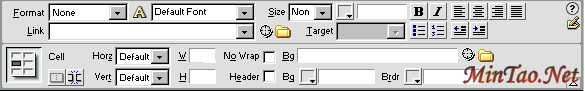 单元格中文本:主要对字体、字号、颜色、对齐方式、是否换行等设置。在这里特别说明的是“NoWrap(换行)”的设置,默认单元格中的文本“换行”的,如果内容较长且要求相对完整,那么就要设置为“不换行”,选中“NoWrap”后的复选框即可,这样在网页浏览时表格的宽度可能超过显示器屏幕。选中“Header”后复选框可将光标所在行设置为标题:文本加粗并自动居中。
