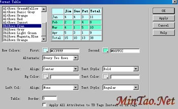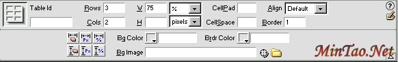 表格背景:在“BgColor(背景颜色)”和“BgImage(背景图象)”域中对背景可设置颜色和图象,在设置背景图象时若表格大于图象,则图象是重复出现的。有时可形成奇特效果。