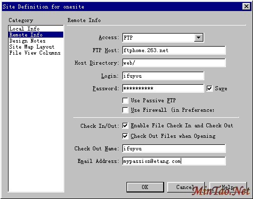 现在来看下半部分。本身Check In/Out是一个副选项,因为单人管理站点时是用不到该功能的。首先要勾选它,才可以看到下面的内容。 其中Check Out Files when Opening即提示我们“在检查文件时打开”,这里的“打开”的内容就是指下面的Check Out Name(检验者名称)以及Email Address(检查者的邮件地址)。它的作用在于,当多位用户同时登陆远程站点进行管理时用来表明各自的身份。 第二步:做完相关设置后,点下OK键返回到站点管理状态,让我们来观察一下,做完设置后站点管理器发生了什么变化。见下图及注解: