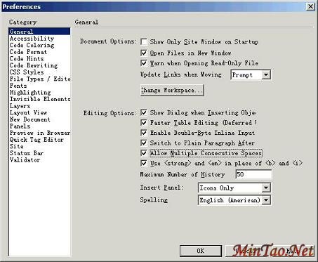 1.启动Dreamweaver MX,选择Edit>Preferences(编辑>参数设置),或按Ctrl+U组合键,打开Preferences对话框。