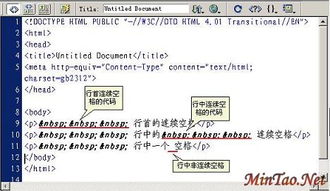 也许,有朋友会发出疑问:用浏览器浏览时浏览器是否“承认”这些缩进的空格?朋友们有这种疑问并不奇怪,因为在Dreamweaver 4中加入的连续空格浏览器是不“承认”的!不过,请朋友们就放心好了,笔者已经过了反复试验,在Dreamweaver MX中没有问题!其实,只要你看看它的源代码,就清楚了!在Dreamweaver MX中,行首的连续空格、行中的连续空格与一个空格(非连续空格)的HTML代码是不同的,请看下图。