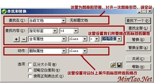 格式是这样的:标签名,标签名。比如这里,我们就应该填上p,span,div(注意:中间用半角逗号“,”隔开)。然后点击确定。稍等一会,会发现我们的文档已经相当干净了。仔细看一下TD标签,会发现它的class属性已经没有意义了。下面我们将它删除。手工一个一个地删?当然不用!我们可以利用查找与替换的命令来把它们全部删除。好,开始行动。