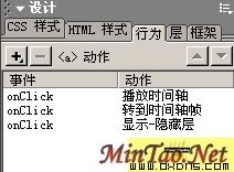 5.我们先设置激活滑动图层的动作。选择上展开这个按钮,转到行为面板,点击在出来的菜单中选择 [时间轴——播放时间轴] DW会弹出一个窗体,在上面的下拉菜单中选择timeline1。