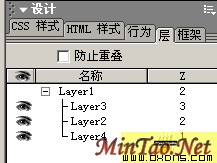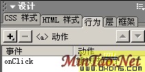 我们先设置激活滑动图层的动作。选择上展开这个按钮,转到行为面板,点击在出来的菜单中选择 [时间轴——播放时间轴] DW会弹出一个窗体,在上面的下拉菜单中选择timeline1。 然后在行为面板中确认事件为onclick 好了,到这里,你可以预览一下,当你点击上展开按钮时,你的图层就会慢慢的从上而下滑动出来! 怎么样,看到了吧:)我们再给图层添加上一个简单的关闭动作,就是点击关闭按钮后图层隐藏。选择上关闭按钮,转到行为面板,点击在出来的菜单中选择 [显示隐藏层] ,在跳出的窗体中选择上layer4,然后点击下面的隐藏按钮,将其设置为隐藏,如图: 好了,再预览一下,发现展开后点击关闭图层就没有了:)不过,似乎有一个问题,再次点击展开的时候,似乎没什么反应了,那是我们还有一个动作没有设置。 重复刚才的步骤5,选择上展开按钮,添加动作 [时间轴——转到时间轴桢] ,在跳出的窗体中的下拉菜单选择timeline1,桢数添上1。 好了,这次预览发现这个问题解决了。但是我们似乎还是忽略了一个问题,点击关闭后这个图层被设置为隐藏了,再点击展开也没反应了。还是运用老办法,给展开按钮添加一个动作就可以解决了! 重复步骤5,选择 [显示隐藏层] ,和刚才步骤6相反,这次我们选择显示,确定后,保证行为面板中显示隐藏图层的时间都是onclick。此刻展开按钮的行为面板如图: 好,再次预览,一切正常! 至此,这个效果就算完成了,当然,大家完全可以自我发挥制作出更好的效果来,但是万变不离其宗,只要我们掌握好了时间轴配合动作行为的运用,所有的效果只是操作问题:)