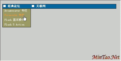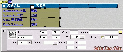 这时候,我们便可以在menu1这个层中输入我们所要的菜单内容。为了排版方便,我在这还是使用表格来做菜单。这个层将作为"经典论坛"的下拉选单出现,填入你所需要的菜单链接。同样的方法,再为"天极网"也做一个下拉选单(层menu2)。