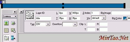 按CTRL+F2打开Objects面板,点击层按钮 后在页面中按住鼠标不放拖出一个层,然后在层的Properties(属性)面板中设置各参数,Layer ID框填入title,L、T、W、H框分别填入8、15、480、15,背景色填入#006699,如图。