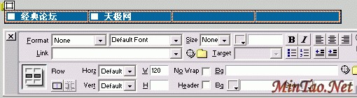 按住CTRL键不放点取表格的四个单元格,然后设置它们的宽度为120,并在前两个单元格中输入文字,就是你的主菜单名,可按自己想要的名字输入,我用"经典论坛"和"天极网"为例,并加上链接。