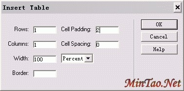 将光标移至层内,点击Objects面板上的表格按钮 ,插入一个一行四列的表格,设置如图。