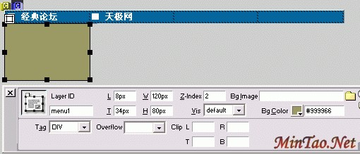 现在开始制作将要下拉出现的菜单,同样用层来制作。 再次从Objects面板插入一个层到前面我们做好的导航条的下方,各项参数填为:Layer ID框填入menu1,L、T、W、H框分别填入8、34、120、80,背景色填入#999966,其中L和T两个参数是设置这个层距离窗口左边框和上边框的距离,一定不能填错,不然菜单将会错位,也将影响完成后的可用性。