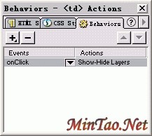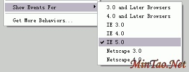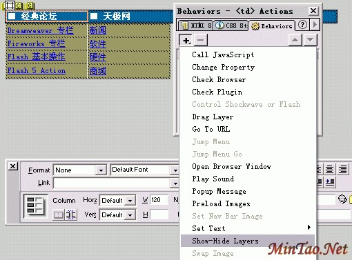 1.导航条部分 首先按CTRL键不放点击导航条中的第一个单元格,现按Shift+F3打开Behaviors窗口,点 按钮,在下拉选项中选中"Show-Hide Layers"(如图)。如果选项中没有这一项,则选择Show Events For下的IE 5.0后,重新点 按钮,此时"Show-Hide Layers"将出现。