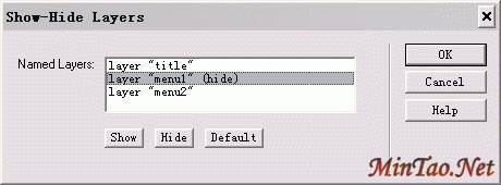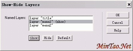 这时将会弹出一个窗口,如下图。在Named Layers框中会列出当前网页所有的层,选中" layer "menu1" ",因为我们想要menu1这个层对"经典论坛"响应。然后点下面的"show"按钮,OK。