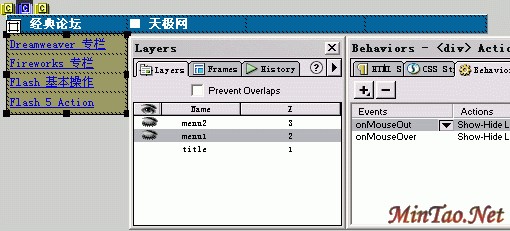 2.下拉选单部分 先选中层menu1,方法是点击层的边缘或在LAYER面板中点击menu1,用与导航条部分同样的方法在Behaviors窗口中为它添加显示与隐藏自己的命令。这样做的效果是当鼠标移出层menu1时,层menu1就自动隐藏。最后层menu1的状态如图所示。