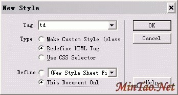 在弹出的"New Style"窗的Tag框内选中td标签,Type选第二项Redefine HTML Tag,Define选This Document Only,如图。