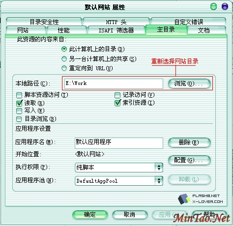 切换到"主目录"标签(图2),重新选择网站根目录(笔者选择的是E盘下的Work目录),默认是"系统盘:\Inetpub\wwwroot",因为系统盘不宜放太多的非系统文件,所以在这里重设默认网站要目录,如果嫌麻烦可以跳过这步。再切换到"文档"标签,通过"添加"、"删除"、"上移"、"下移",把站点的默认文档设置如图所示: