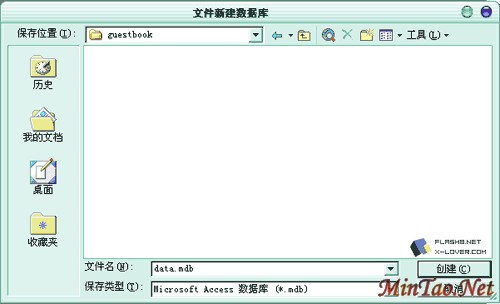 要保存这么多信息,数据库应该怎么设计?访客的留言是不断增加的,而主人的管理帐号固定不变,所以应该分开两个表,一个保存所有访客的留言和访客的资料信息,另一个则保存主人的管理帐号。OK,现在可以开始设计数据库了。打开ACCESS(在微软的Office软件中有)软件,新建一空白数据库,ACCESS会提示先保存数据库,定位到你的留言本所在文件夹(笔者是在站点根目录下建了一个guestbook文件夹),保存为data.mdb: