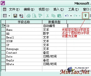 ID:设为主键,确定数据唯一性以保证在管理时能准确定位到相应记录 Name:字段大小设为15(很少有人的名字有这么长的吧?) Email:字段大小为20(也很少有Email地址的长度超过这个数字) ICON:字段大小为6(看完后面的教程就明白为什么设这么小了) IP:字段大小为15(可以算出来,四个三位长的数字再加三个小数点) Homepage:字段大小为30(很多朋友还在用二级甚至三级的域名,所以放宽一点) Date:默认值为Now ()(用Now()取得插入新记录时系统的时间)