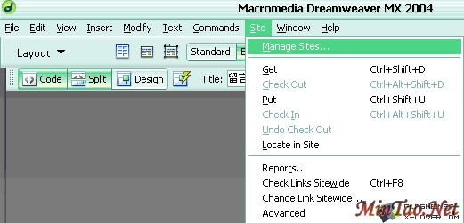 打开DW,在"Site"菜单下找到"Manage Sites..."项单击,见下图: