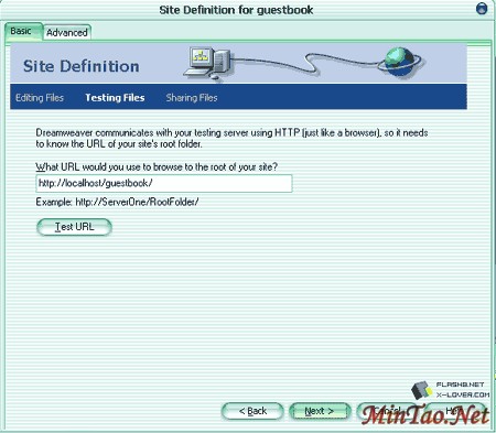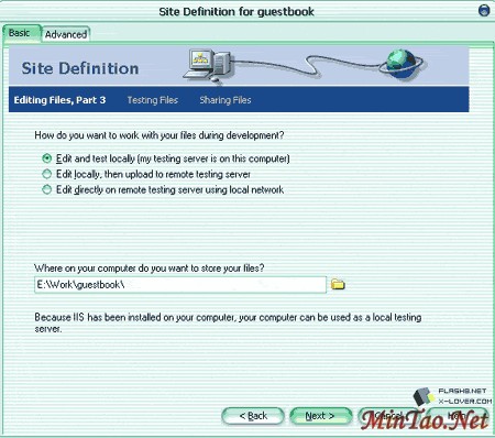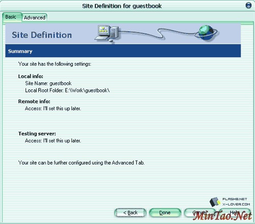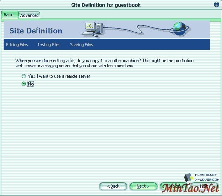 细心一点的朋友也许会发现,在站点定义对话框上有两个标签:"Base"和"Advanced",其实用途是一样的,只不过"Base"是一步一步的向导模式,而"Advanced"是给对DW有一定了解的朋友用的高级模式,有兴趣的朋友可以自行切换到"Advanced"模式看看。