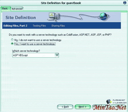 点"Next>"继续下一步的后台技术选择,这里我们选择用VBScript作脚本的ASP: