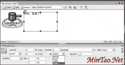 第二步 通过“Insert→Layer Objects→Layer”命令在图像旁边添加一个层,并且输入需要显示的话。选择这个层之后,在属性面板中将“Vis”属性设置为“hiddend”来隐藏该层(如图2)。