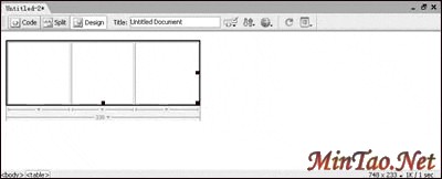 第一步 新建一个页面,然后通过“Insert→Table”命令插入一个一行三列的表格,此时可以先不管它的宽度,而是通过下述设置让它自动伸展适合浏览器窗口。