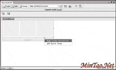 第二步 这时可以看见每个单元格下部都标明了宽度且有一个小三角形(如图3)。在这个表格中,可以设定哪部分是需要固定的,不过只能让一列自动伸展,比如此处我们设定最后一列随着窗口大小的变化自动伸展。