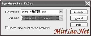 第五步 在右部本地硬盘窗口中用鼠标选取需要上传的文件,并且将其拖拽到左部远程服务器的相应目录中即可开始文件传输操作,稍等片刻之后就完成了文件上传任务。 提示:可以通过“Shift”或者“Ctrl”按钮来选择多个文件上传。 在网页文件全部上传之后,我们就可以打开IE浏览器,输入相应的URL地址之后就能够看见精心制作的网站了。 同步更新网站 同步更新网站是一个可以让你同步管理本地文件夹和远程网站的功能,当你的网站经过多次上传和更新之后,可能会使得远程网站中多了不少无用的旧文件,这就非常浪费空间,此时可以借助文件同步化功能来同步更新网站。 第一步 在Dreamweaver MX 2004中进入站点窗口,登录到远程服务器之后将辅助面板切换到扩展模式,接着设定好本地文件夹和远程服务器的目录。 第二步 在辅助面板运行“Site→Synchronize”命令,此时可以看见图3所示的对话框。首先在“Synchroniz”下拉菜单中选择整个网站还是选中的文件,接着从“Direction”下拉列表中选择“Put newer files to romote”一项,这样可以由Dreamweaver MX 2004自动寻找本地文件夹中更新过的文件上传到远程服务器中。