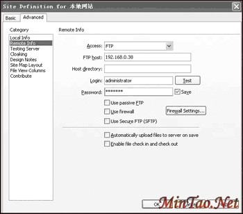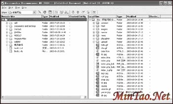 提示:在将所有信息输入完成之后,可以点击“Test”按钮来查看是否能够顺利登录到远程FTP服务器。 第四步 确认之后,Dreamweaver MX 2004将自动出现站点辅助面板,在此先点击“连接”按钮建立与远程站的连接,接着按下辅助面板最右部的“Expand/Collapse”按钮,这时即可将辅助面板扩展显示(如图2)。在默认情况下,左边窗口显示的是远程站点中的文件,右边窗口则是本地硬盘中的文件。