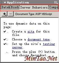 启动MX (以后在文章中都叫MX了,Dreamwerver不加了,打字麻烦),启动界面和Flash MX感觉差的,的确我想别的MX产品可能都是这样的吧!进入界面以后布局和Flash MX很象,面板颜色和位置都是差不多的,这方面的统一使得广大的使用着更加容易上手了。我们在这里主要讨论Application面板(因为和Asp有关的东西都在这里了),其他面板我们就不在此探讨了,那是老虎的事情,如果是新手,我只能在此向你说抱歉了。