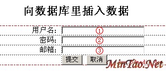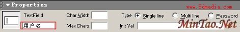 注意到上面的红色数字了吗?不要急,这里还有一点要注意,如图(3-6)所示。要指定这些文本框的名称,第一个“用户名”我把它后面的文本框指定为“用户名”,其它两项雷同,分别指定为“密码”,“邮箱”,只是要注意密码这一项的类型(Type)要指定为Password,这样用户在输入密码的时候看到只是一串*号了。注:以前在UD里给文本框命名不能用中文,但现在在DW MX里也可以用了。