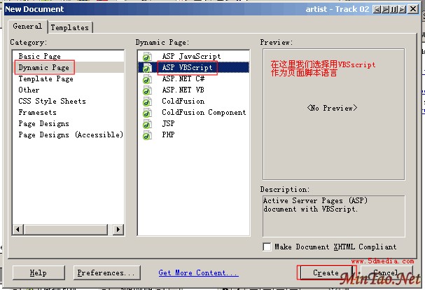 <1> 点击后你会发现,出现的页面和以前DW或UD很大的不现,如图(3-2)所示。DW MX在创建不同的动态网页方面显得非常方便,可以随意的选择自己想要的类型,而不用像以前一样还要选保存类型。在这里我们选择创建动态页面(Dynamic Page),选择VBScript作为页面的脚本语言。OK,保存为insert.asp。