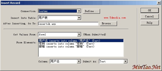 After Inserting, Go To:这充许在完成插入后把用户重定向到另一个页面,即数据成功保存进数据库后显示给用户看的页面,告诉用户数据已插入进数据库里。在这里我们定义为insertok.asp。注:不要忘了建立这个页面呀,如果找不到页面就会报错哦!