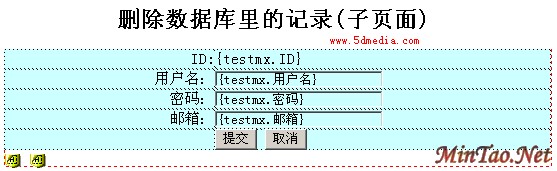 <2> 好,前期工作已准备完毕,这次我们的主角是Delete Record(删除记录)的服务器行为。它的功能也很简单,看名字就知道它就是专门用来删除记录集的。OK,建立我们的子页面,接收第一个页面传过来的值,显示相对应的数据库记录。这些在第四章里我们也有讲,最终显示效果如图(5-3)和(5-4)所示。记得要把表格放进表单里,并对里面的文本框进行命名。