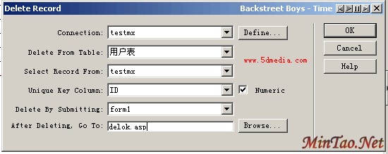 After Deleting, Go To:完成此删除操作后跳转到哪个页面,在这里我们输入delok.asp。(不要忘记建立这个页面哦!)