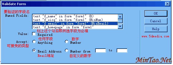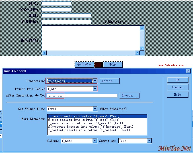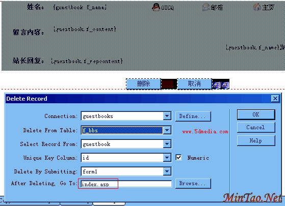 这个是del.asp页,同样要建立表单哦,不过不用把姓名等改成文本框了,因为只是删除数据,重要的还有Move To Specific Record服务器行和Delete Record服务器行为,最后定义删除后转到index.asp页面。