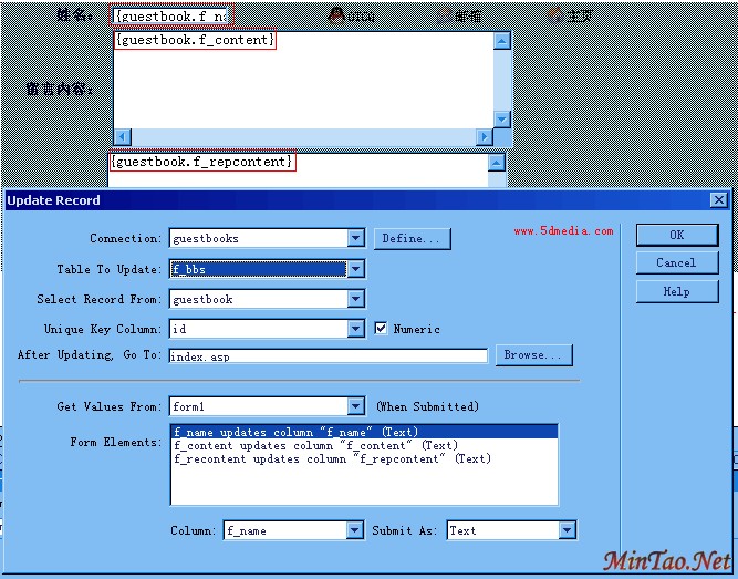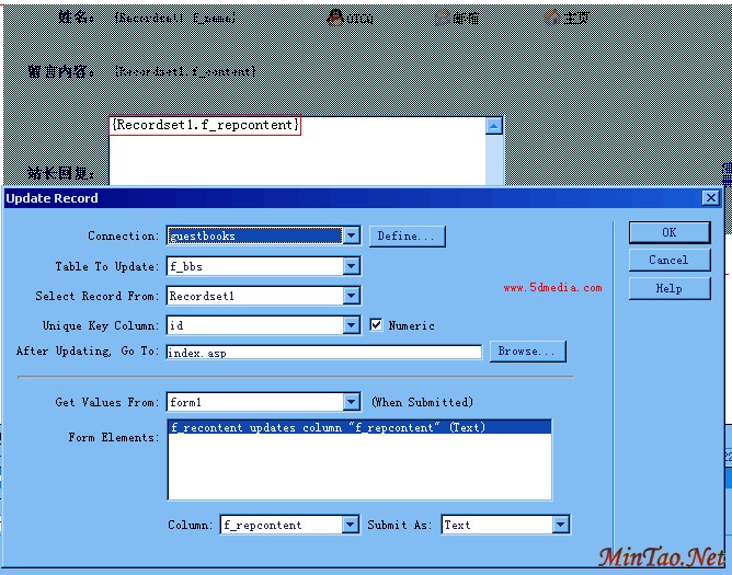 这是rep.asp页,这个页面和上面的edit.asp页面差不多,也是运用了Updata Recordt服务器行为,不过不同的是它只更新了一个字段内容,同上要运用Move To Specific Record服务器行为,把站长回复改成文本框,以便超级用户可以输入内容。