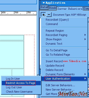 现在我们要回一下头了,我们的edit,asp,del.asp,rep.asp都是不能让别人随随便便访问的,这里就要用到页面保护的服务器行为。Application-->Server Behaviors-->User Authentication-->Restrict Access To Pags(应用程序-->服务器行为-->用户鉴定-->页面数据保护),如图(7-45)所示。