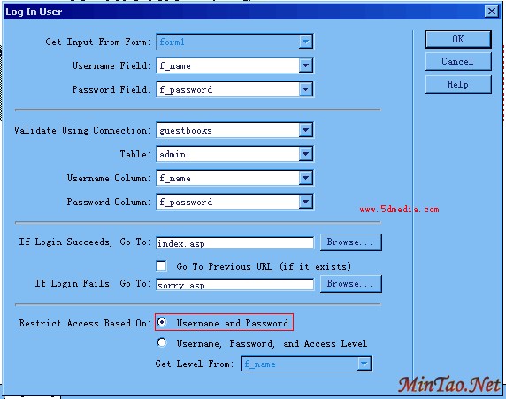 Get Input Form Form:在这个下拉列表中选择接受哪个表单的提交,我们这里只有一个表单,所以不用选择。 Username Field:在这里选择用户名所对应的文本框。我们刚才定义了用户名的文本框名为f_name,所以这里也选择f_name。 Password Field:在这里选择用户密码所对应的文本框,同上。 Validate Using Connection:这里选择要使用哪一个数据库连接。 Table:要使用数据库中的哪个表。这里要注意一下,在这里我们要使用admin表,虽然以前我们一直用f_bbs表。 Username Column:选择用户名对映的字段,这里选择数据库里的f_name字段。 Password Column:选择用户密码对映的字段,同上。 If Login Succeeds, Go To:如果通过验证后到哪个页面,这里我们定义返回主页index.asp。 If Login Fails, Go To:如果没有通过验证到哪个页面,这里我们定义返回到sorry.asp。 Restrict Access Based On:因为我们要对一些页面进行访问限制,如编辑和删除等,所以要用到这个。在后面的类型选择Username and Password,即用户名和密码。